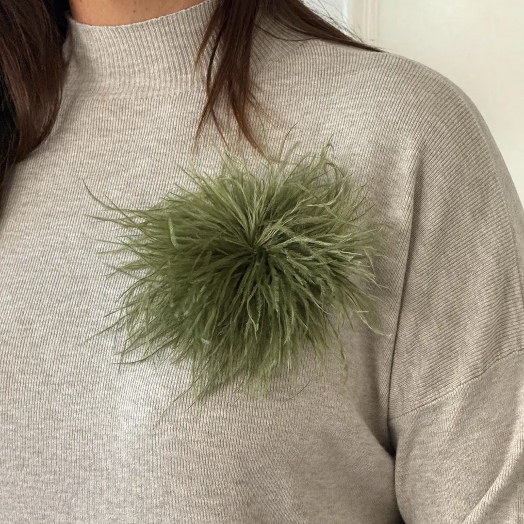 Realizzato in un morbido tessuto dalla vestibilità fluida, questo completo è composto da maglia a collo alto e pantaloni a gamba dritta, entrambi caratterizzati da linee essenziali e senza tempo. Il dettaglio di piume applicate sulla spalla aggiunge un tocco sofisticato e scenografico, capace di rendere unico anche il look più minimal.