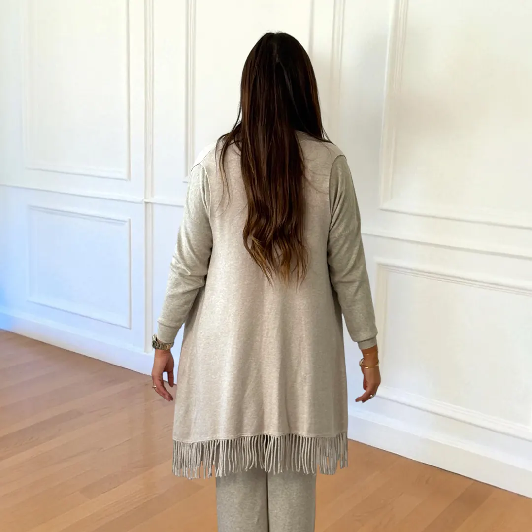 Diana è un raffinato gilet lungo con frange, ideale per completare con eleganza ogni outfit.